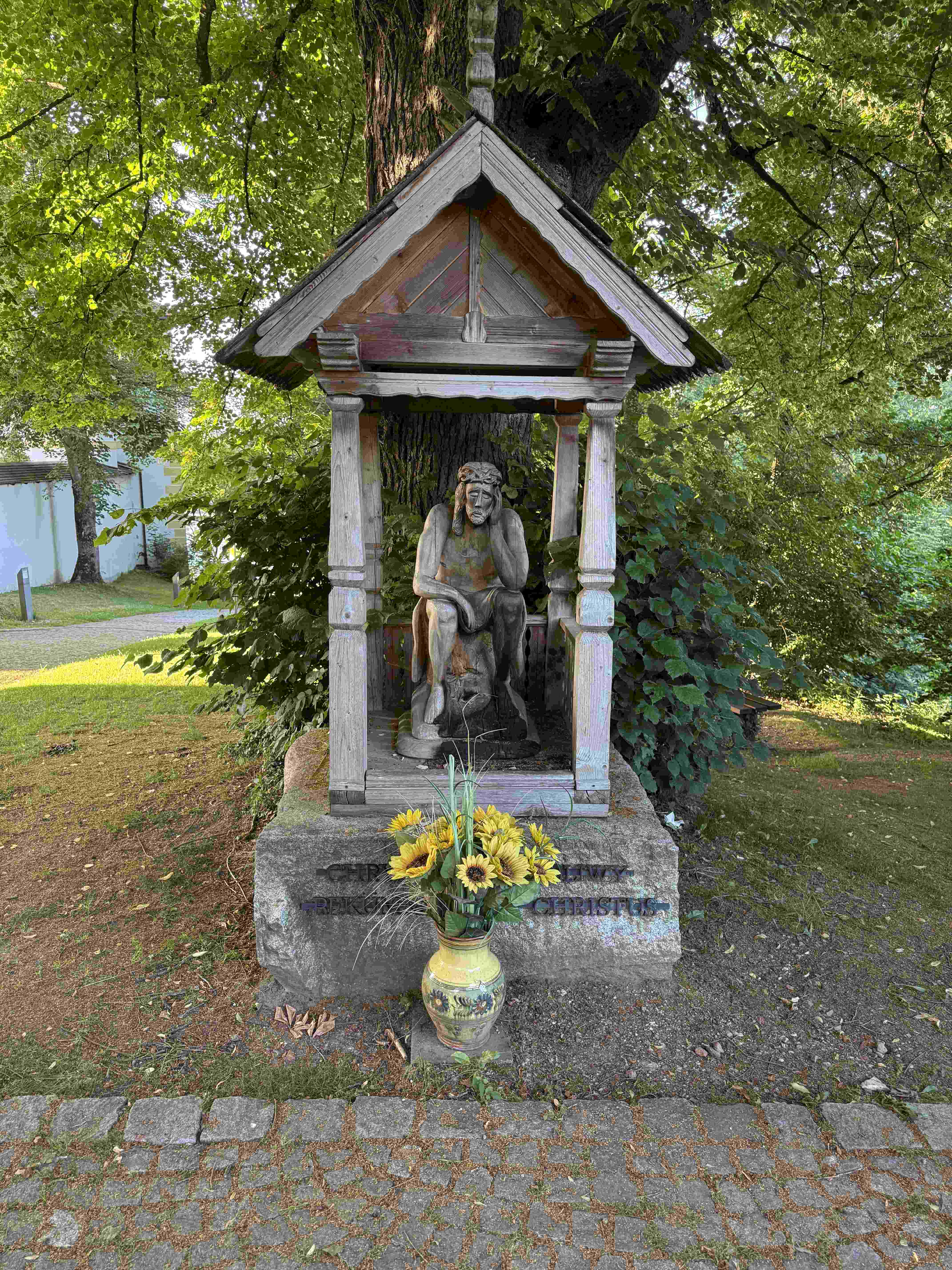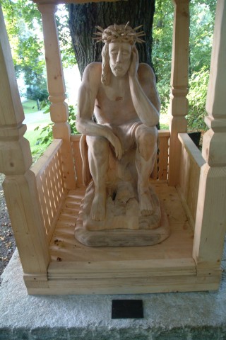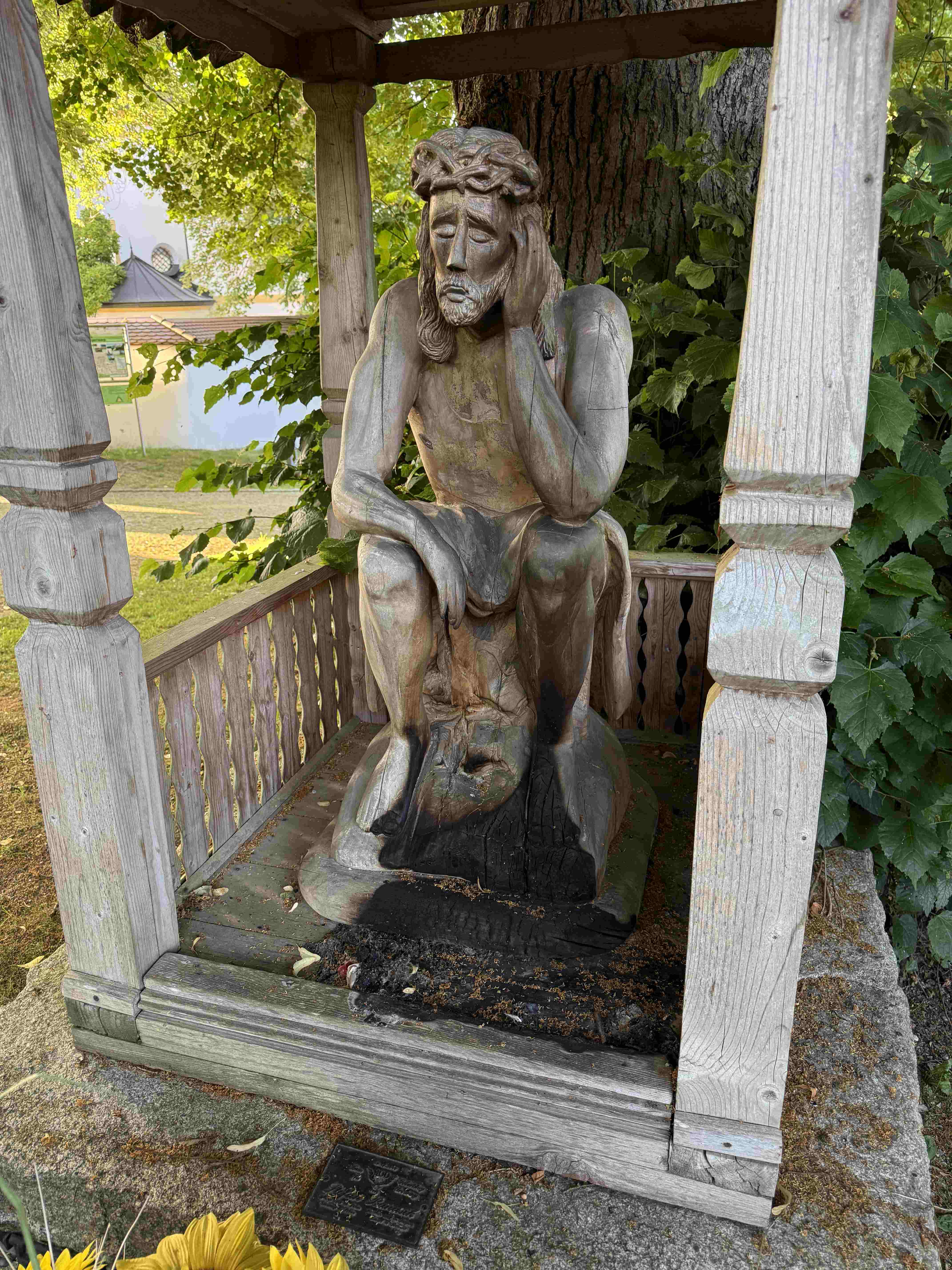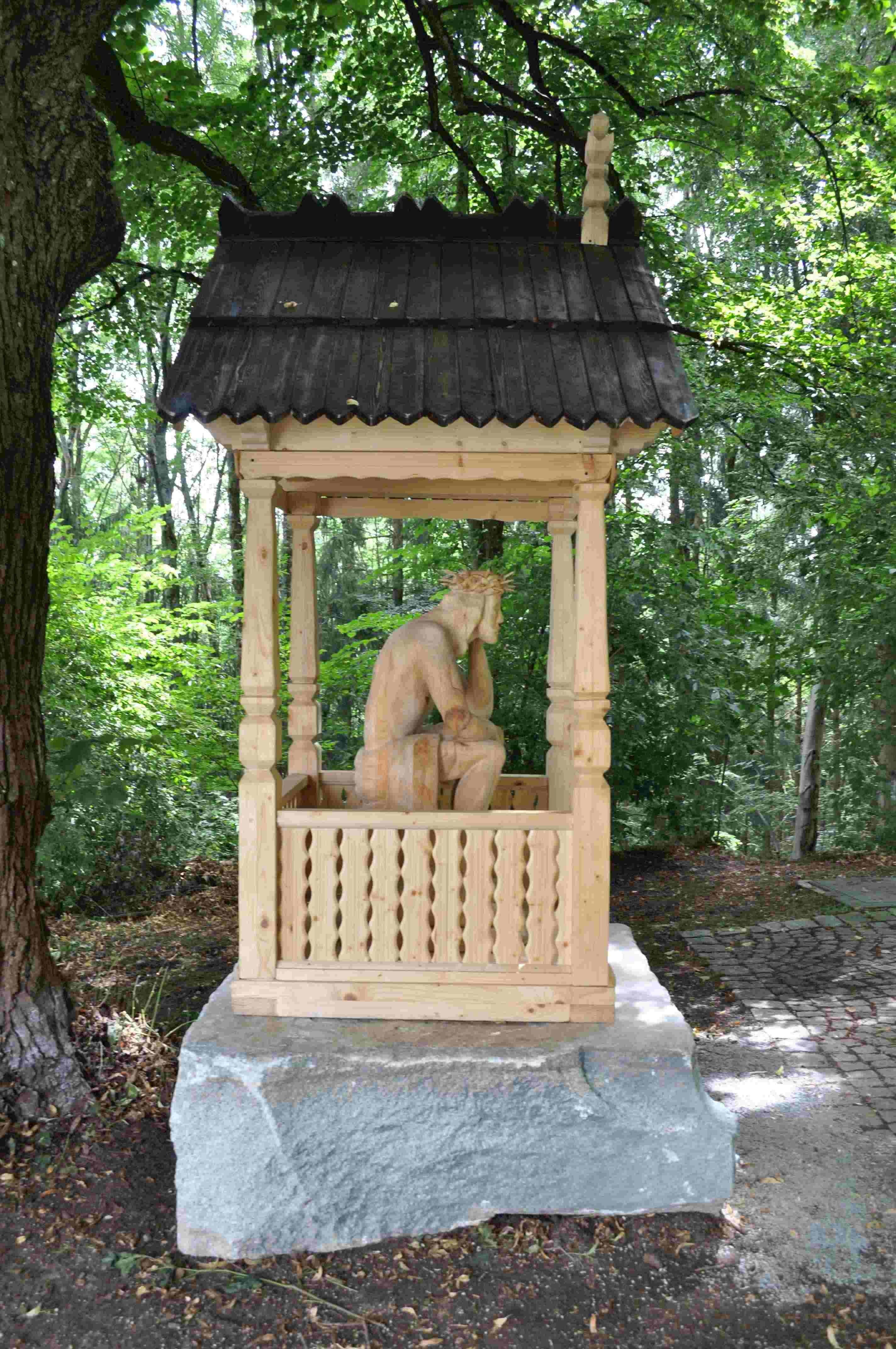 Dieses Kunstwerk besteht aus mehreren, miteinander verbundenen Einzelteilen. Zum einen gibt es das Fundament, welches ein Steinsockel samt Inschrift darstellt, desweiteren thront auf dem Steinsockel ein hölzernes Haus mit vier Füßen und Dach, unter welchem eine Holzfigur des bekümmerten Christus positioniert ist. Die Darstellungsform „Christus in der Rast“ (Chrystus Frasobliwy -> Inschrift) hat eine lange Tradition in der christlichen Kunst, besonders in Plastiken, und zeigt Jesus wie auch in diesem Fall sitzend, die Wange auf die (in diesem Fall linke) Hand gestützt, der Ellbogen auf den Oberschenkel - eine universelle Geste der Ermattung bzw. der Trauer. Christus trägt eine kranzartige Krone und ein tuchartiges Gewand, welches Intimbereich und einen Teil der Beine des ansonsten nackten Jesus verdeckt. Das Holz des Dachs und der Füße, auf welchen das Dach steht, ist an einigen Stellen verziert, bzw. grundsätzlich bearbeitet. Vor der Holzkonstruktion befindet sich oberhalb des Steinsockels ein kleines metallenes Schild, auf welchem eine Widmung, bzw. ein Anlass für die Entstehung des Kunstwerks steht. Darunter, auf der Vorderseite des Steins, befindet sich in großer Schrift der Titel und seine deutsche Übersetzung. Davor steht auf einer kleinen Steinplatte, die in den Boden eingelassen ist, eine kleine Laterne. (Annika Fricke)