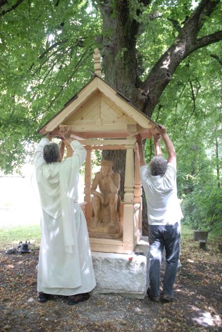 Das Kunstwerk ist von Waldemar Banasik als Andenken an seinen Vater Stefan Banasik und dessen wechselreiches Leben nach dessen Tod im Jahre 2007 in Auftrag gegeben worden. Da Stefan Banasik aus Jaworzno (Arnshalde) im damaligen Oberschlesien stammt, wurde die die Skulptur umrahmende Kapelle im sog. Zakopane-Stil gestaltet und in Zakopane gefertigt, bevor sie von Polen aus nach Bayern gebracht und auf dem Gelände des Klosters Mariahilf aufgestellt wurde. Das Kloster Mariahilf wurde als Aufstellungsort ausgewählt, da es sich um den Geburtsort von Waldemar Banasiks Frau handelt und das Kloster von polnischen Pauliner Mönchen geführt wird, die aus dem polnischen Pilgerort Tschenstochau bekannt sind.