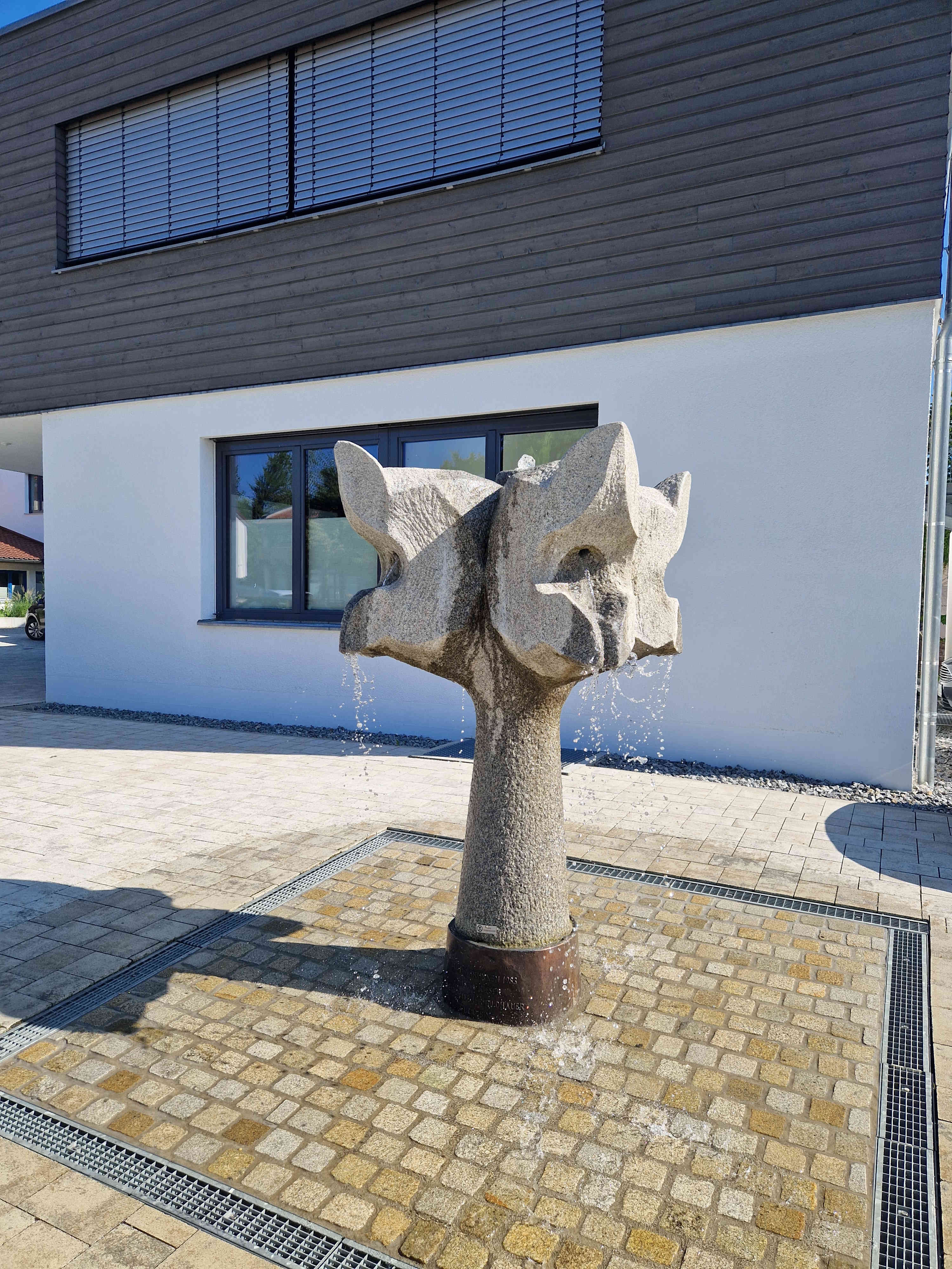 Der Brunnen ist aus Mettener Granit, aus einem Stück gearbeitet. In Zusammenarbeit mit Steinmetzmeister Willi Kaiser aus Bogen ist der Brunnen im Verlauf einiger Monate entstanden.