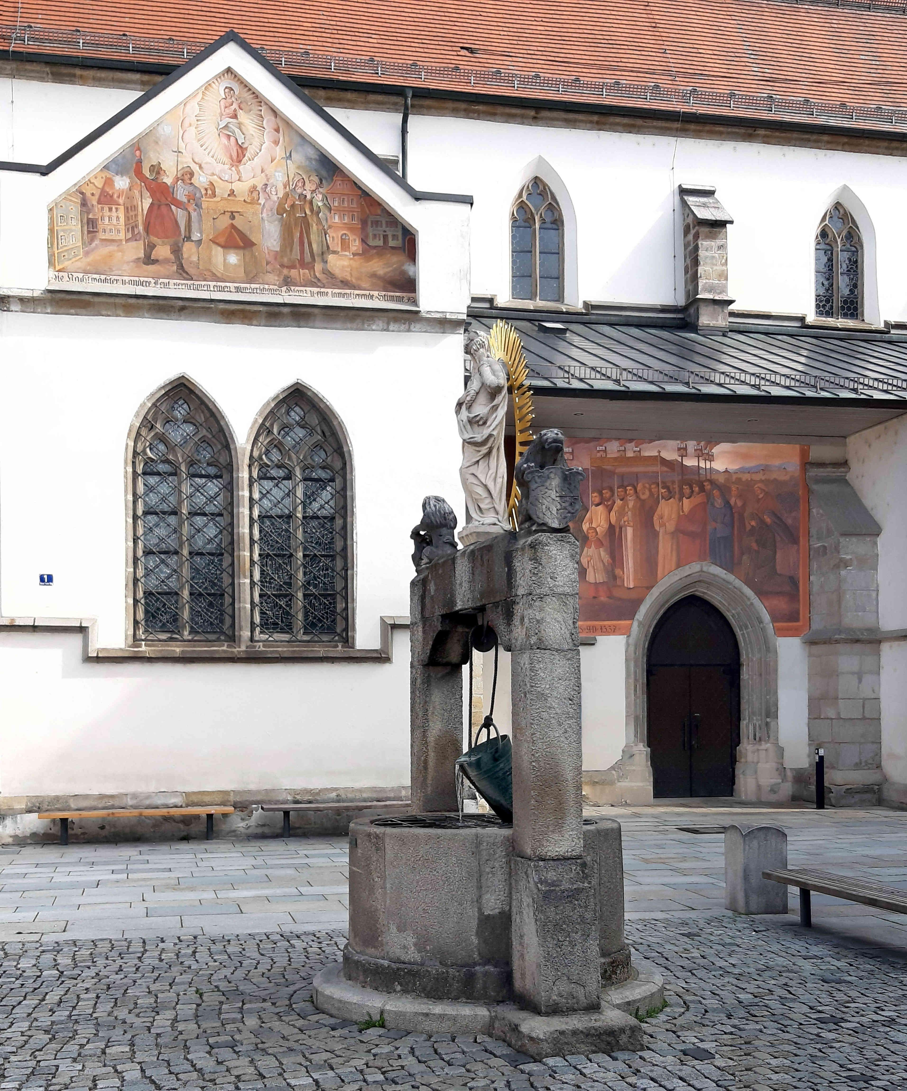 An der Kirche befinden sich drei Wandmalereien, die im Verlauf der Jahrhunderte mehrmals erneuert werden mussten. In den 1950er Jahren hat man den aus Schaufling stammenden Kirchenmaler und Restaurator Gotthard Bauer (1887 bis 1976) damit beauftragt. Die heutigen, an die vorherigen Versionen angelehnten Fassungen schuf Wolfgang Harms zwischen 1976 und 1980. Das Bild über dem Nordportal stammt laut Manfred Eder (Die „Deggendorfer Gnad, Deggendorf 1992, S. 410-412) ursprünglich aus der Zeit um 1630 und stellt die Grablegung Christi dar. Die anderen beiden Szenen beziehen sich auf fiktive Ereignisse aus den 1330er Jahren. Das Gemälde am Giebel der Bäckerkapelle an der Südfassade (erste Fassung wohl um 1730) zeigt die Auffindung der von den Juden in den „Gnadenbrunnen“ geworfenen Hostien, das über dem Südportal angebrachte (ursprünglich um 1500) die feierliche Übertragung derselben in die Pfarrkirche Mariä Himmelfahrt, die sich außerhalb der Stadtmauern befand.